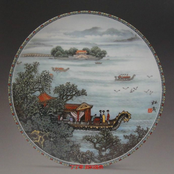 [昆明湖] 工艺美术家张松茂将颐和园的精华,倾注于彩盘[昆明湖]中,生动地再现了这古代皇家宫苑的秀美静谧,使蓝天碧海、园林建筑皆融为一件艺术精品。且让我们与 游湖客结伴,同赏美不胜收的景致。皇家所修筑之颐和园里的昆明湖,经扩大后,浑似一块晶莹的碧玉,而湖中更有南湖岛及其十七孔桥。岛上有一座供奉龙王的庙 宇;据说祭奉神祗可保佑昆明湖波平浪静。在布局上,张松茂大师独具匠心,安排画舫在前景,而置寺庙与其上,巧妙地构成了寺庙俯看和守望着微波的形象,同时 也点处了颐和园建筑中最呕心沥血造出的特色,即是在局限上的空间里展现辽阔的天地。在整体构图上,张松茂大师将画舫置于下方,十七孔桥及南湖岛置于左上 方、及玉泉山塔置于右方,即完全统摄宫苑秀美、建筑精巧的外观,同时也充分捕捉其宽广,无拘无束的格调。彩盘[ 昆明湖] 的构图,饶有深意:画面的中心仅是湖水,如此,则鉴赏者的注意力,不会单一集中于个别景致,却扩展至颐和园的全景,张松茂大师精心勾画呈现的全景,所给予 我们视觉艺术上的美感,绝非任何局部景致可达致。他以神来之笔,让有幸亲睹皇家宫苑的游客所深感身受。昆明湖畔秀雅怡人,颐和园的一景一物,在在都有清幽 神境,引人遐思,可想而知,当年皇帝多么乐于在此休憩。张松茂大师在[中国颐和园之景]瓷盘最后一集的绘画里,再次臻至美学的极致。当观赏者欣赏画中前景 的传杨垂柳之际,似乎也化身为期间的游湖客,沉醉于颐和园独具的祥宁,静谧里。昆明湖是颐和园的主要水面,占全国面积的四分之三,约220公顷。南部的前 湖区碧波荡漾,烟波淼淼,西望起伏,北望楼阁成群;湖中有一道西堤,堤上桃柳成行;十七孔桥横卧湖上,湖中3岛上也有形式各异的古典建筑