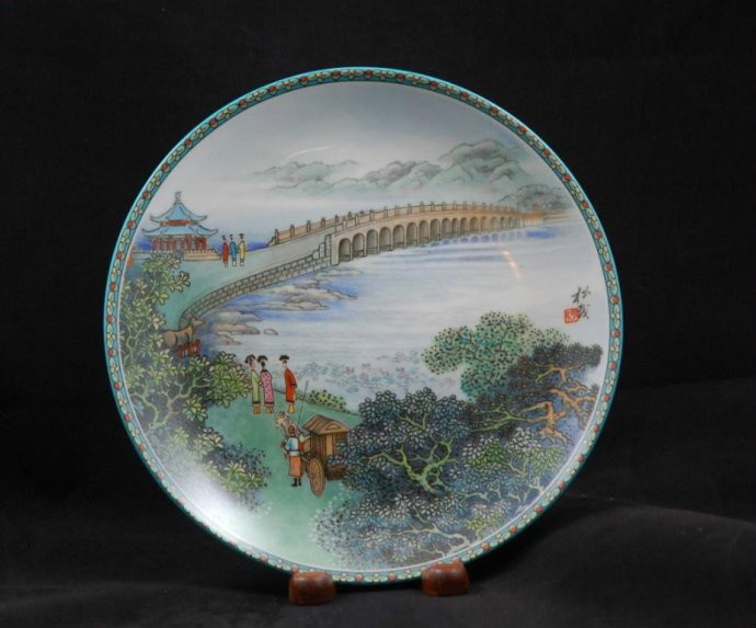 [十七孔桥] 在彩盘[十七孔桥]里,工艺美术家张松茂描绘了壮丽的十七孔桥,这座桥被誉为[湖上的彩虹],它具有无可比拟的魅力。十七孔桥看似奇妙的浮在波平如镜的昆 明湖上,实则连接了陆地与湖中的一座小岛,岛上供着一座传说能保风平浪静的寺庙。当乾隆皇帝大规模地修建颐和园时,他会下旨扩建昆明湖,并因冀望长生不 老,刻意建了一座小岛,代表传说中神仙居住的蓬莱仙岛,岛上并肩有供奉龙王的寺庙,以便献上祭品,请龙王守护湖面波平浪静。十七孔桥堂皇地伸延至岛上,它 展现了一个自然景观所赋予的典雅气派及不需渲染得优美,同时也表现了乾隆年间建筑师及工匠严禁有序的筹划,设计和建造。当然,还是天上丽质的魅力,使十七 孔桥及其四周的景色,如此别具风采。这幅风景所呈现的优雅和谐及纯朴的美丽,再在巧夺天工。由于桥上的十七个弧洞,以及湖上的小岛,皆是一沙一石由人工建 造,人们不仅对十七孔桥叹为观止,并且也一致认为十七孔桥是湖上的彩虹、天然的瑰宝。同时,甚至面对如斯静谧的景致,自然也乐见风平浪静了。张松茂大师在 为[中国颐和园之景]系列所绘制的最新的一个瓷盘里,将十七孔桥的神妙、优雅及独特,表达得淋漓尽致。在色彩运用方面,他以别致而微淡的海绿色及暗灰色画 桥,使之与波平如镜的湖面、和附近苍绿色的树木,及浅褐色的枝丫相得益彰。张松茂使用相近的色调,为人工的建筑和天然的风景敷色,为二者制造一种视觉上的 对称,促使艺术与自然分界朦胧,进而使二者合为而一。张松茂大师绘制的[十七孔桥],使人几乎察觉不出自然与艺术的分界---正如颐和园里的十七孔桥,拉 近了人工与天然的距离。直到今天,当我们看到神仙居住的岛及建筑壮观的桥,我们仍然觉得它横跨了人间与仙境的鸿沟。十七孔桥坐落在昆明湖上,飞跨于东堤和 南湖岛之间,用以连接堤岛,为园中最大石桥。宽8米,长150米,由17个桥洞组成。两边栏杆上雕有大小不同、形态各异的石狮500多只。