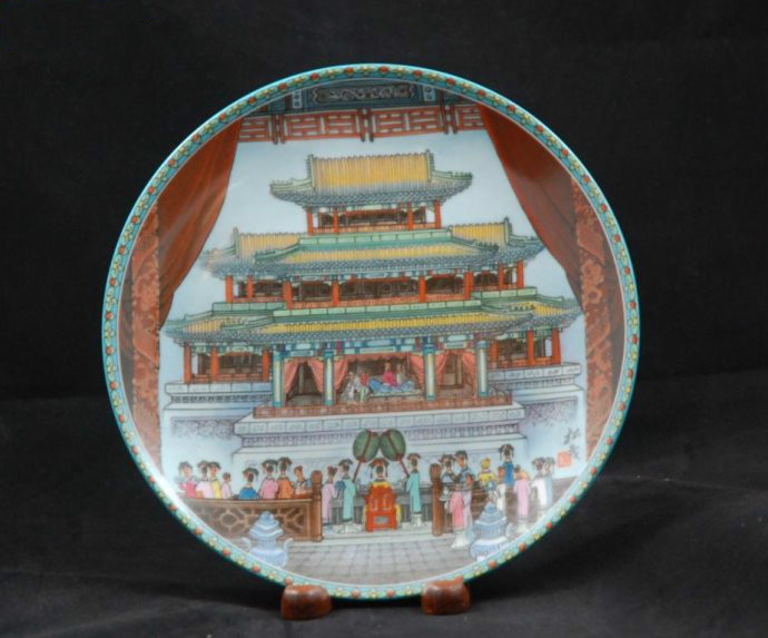 [大戏楼] 在彩盘 [大戏楼]中,工艺美术家张松茂通过描绘帝王家族看戏行乐的主要场所——[大戏楼],生动地再现了当年颐和园内的生活场面。大戏楼建于一八九一年,是慈禧 太后重修颐和园计划中的一部份,其目的不过是为了是慈禧太后穷奢极欲的心愿。大戏楼高二十一米,分上下三层,台宽十七米,是当时中国[三大戏楼]之一,也 是其中最大的一座。大戏楼与现代舞台不同,它是一座独立建筑,立于观众席之外,观众站在大戏楼之外看戏,什么是戏,甚么是生活?一时难以分辨,好像现实与 遐想的墙桓也已拆除,过路的行人也可以一睹王族贵戚的神秘世界。 [大戏楼]画盘布局巧妙,妙不可言,巧妙地构思把观众的注意力从舞台上的帝后双双观看歌舞的戏情引到前景中慈禧太后坐在观众席上欣赏的戏中戏场面。这里, 画家所采用的是艺术和现实柔和在一起的传统国画手法,是以描绘当年颐和园内的生活场面,究竟戏止于何时?现实始终何时?真真假假,何须分辨?颐和园中的建 筑无一不是珍品,无一不是对美好大自然的歌颂。在这里,生活本身就是一场游园金梦。张松茂大师融艺术与现实之中的手法引入入胜,令人产生亲临其境的感觉。 他所创造的意境超出了瓷盘范围,又令人遐想:瓷盘的边缘有如舞台帷幕卷起,给人以身临观众席看戏的幻觉。这样,瓷盘欣赏人也不由产生融艺术与现实为一体的 朦胧画意,何谓艺术?何谓现实?欲变以忘言。舞台上演出的不再是画面上唯一的戏剧,慈禧太后也成了彩盘欣赏人眼中剧情内容之一。颐和园中自然与艺术界线模 糊,合二为一,我们竟也感到自己成了张松茂笔下的画境之一。张松茂大师成功的再现了历史上的帝王将相寻欢作乐的戏剧场面。他把我们带回到一个奇特的地点和 年代,是我们的一欣赏帝后在人间天堂中尽情享乐的情景。大戏楼在德和园内,是为慈禧60岁生日修建,专供慈禧看戏。高21米,仅次于最高的佛香阁。戏楼共 三层,顶板上有七个“天井”,地板中有“地井”。舞台底部有水井和五个方池。
