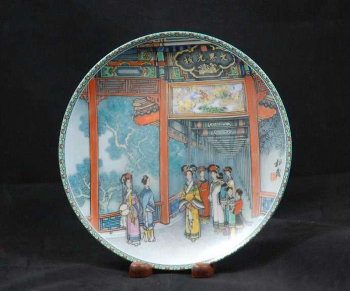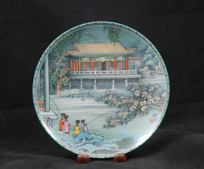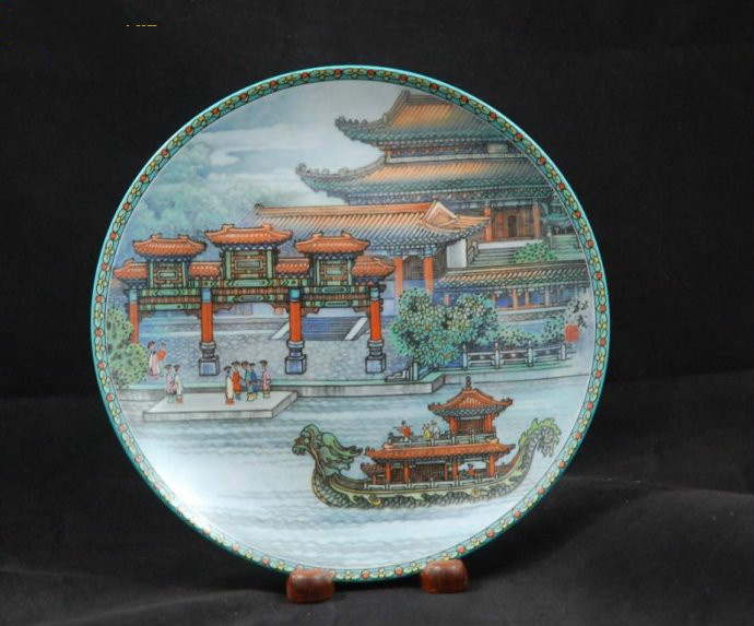 [石舫] 微风轻拂,驱散了笼罩在山水幻影上的晨雾。碧波荡漾、湖光粼粼的昆明湖,湖畔的石舫——清晏舫,仿佛刚从长眠中苏醒过来。颐和园览湖之胜,且兼具庭园风 光,而[石舫]正好体现了它精巧华丽的特色,使此游览胜地堪称露天艺术画廊。[石舫] 为张松茂艺师所绘瓷盘集第一集之主题。中国传统画中的船只一般表现为扁舟一叶,漂浮于江河溪水之上,而江河溪水也往往给人以清波微浪、腾云驾雾之感。约一 个半世纪以前清朝乾隆皇帝初创颐和园时就构想建造一艘奇妙的船,目的并非用来游览浩瀚的昆明湖,而是如中国古代文人所一贯向往的,作为娱乐宴饮,吟诗作 画、凭栏远眺的场所。此乃石舫之由来。石舫之设计纯粹基于艺术本身的需求,因为一眼即可看出,它实为一个固定的建筑物,毫无航行功能可言。石舫长三十六米 (一百多英尺),全部由大理石砌成,它似乎在向游人宣称:此船非真船,仅供赏玩而已。石舫的营建确已达巧夺天工的境界。窗户镶嵌着珠宝色的窗户,甲板铺的 是细雕砖块,天花板更有华丽的雕刻。从拱形的窗洞向外望去,全园景色,美不胜收。此外,两层甲板上都设有大镜,游客可如赏画般,从画框中欣赏景物,而览颐 和园的却风景如画。身临此境之游客往往乐不思返。为此,中国工艺品公司有幸介绍工艺美术家张松茂所设计之瓷盘,将此精巧的建筑再现于帝王所爱之景德镇精美 细瓷上。张松茂之[石舫] 承传了中国山水画的传统,艺术创造远胜于单纯模仿:远处树木犹如岸边云烟,平静的昆明湖水则波若软缎。石舫上下以柳叶与桃花烘托,使画面意境胜过真景。画 面下端还点缀以穿这花冠丽服的宫廷仕女,含蓄而适宜的给画面增添了历史色彩。我们要说,您如欲真正了解中国,只需仔细端详这珍品瓷盘,直至心领神会,便可 有所收获。以[石舫]瓷盘向其他民族介绍中国历史与艺术,可为最强当不过。石舫在长廊西端湖边,是一条大石船,取名清晏舫,寓“海清河晏”之意,是颐和园 唯一带有西洋风格的建筑。长36米,船用大理石雕刻堆砌而成,船身上建有两层船楼,设计十分巧妙。