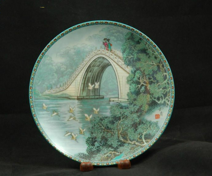 玉带桥] 西南天际堆起了乌云,湖畔树影摇曳,枝叶在湖面掀起了涟漪。夏天的阵雨骤然来到,雨点打在宽大的荷叶上,清脆悦耳。旋而雨过天晴,只留下微云几抹。有人已 至,而颐和园仍在烟雾朦胧中,清寂一片。无论是春夏秋冬,佛晓日暮,不伦是阴晴雨雪,颐和园的景色总是变换无穷,无时无刻不令人赏心悦目。要说胜景中的胜 景,当推玲珑挺秀的玉带桥,这正是张松茂所绘[中国颐和园之景]瓷盘系列第二集的主题。这座御苑水面广阔,湖泊池塘多以桥做点缀,即与周围风景相互烘托, 又为之添姿增色,表现了中国园林艺术将建筑美与艺术美巧妙的结合的特点。这些精美建筑通常设在景观醒目之处,即可入美玉装点景色,又可借与饱览秀色。玉带 桥体现了上述的双重作用。它和昆明湖西堤上其他五座桥,恰如六颗明珠镶嵌在堤上桃红柳绿之间。西堤是乾隆皇帝建造清漪园时下令仿杭州西湖蘇地的桥景所营 建。向西远眺,玉泉山一览无遗。向东北观望,昆明湖和万寿山尽收眼底。六座桥中有四座绿柱红栏的亭台,供人凭栏赏景,但是最著名的,有人最多的仍是玉带 桥。张松茂笔下的玉带桥线条流畅优美,既显示了桥柱的精细雕工,又突出了桥洞与水中倒影相互辉映的风韵。张氏的[玉带桥] 是中国山水画的光辉典范。道家主上人与自然交融。中国山水画的艺术思想正是基于这种哲学。中国古话云:[诗中有画,画中有诗]瓷盘[ 玉带桥]正是如此,而且呈现了中国北派园林艺术的特点,线条浑厚,色彩瑰丽,以蓝绿金黄为主,与南派的水墨渲染手法迥然不同。张松茂以其高超技巧表达了一 种超时空超自然的意境。白鹤低掠水面,沉暮迷蒙,远处堤岸隐约可见两位窈窕宫女,亭亭玉立。[玉带桥]彩盘将观赏者带回到中国古代盛世乾隆皇帝在[ 昆明湖泛舟]一诗中所表达的意境:[何处燕山最畅情,无双风月属昆明]。玉带桥位于颐和园昆明湖长堤上,建于清乾隆年间,该桥单孔净跨11.38米,矢高 约7.5米,全部用玉石琢成,桥面时双反向曲线,组成波形线桥型,配有精制白石栏板,显得格外富丽堂皇,蛋尖形桥拱,特别高耸,好似玉带。