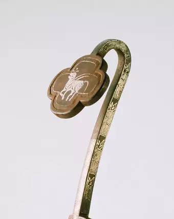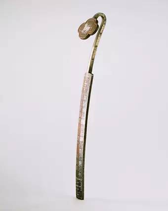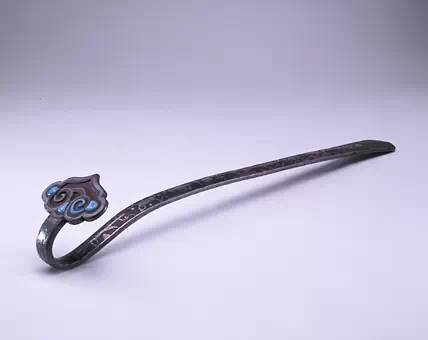 此如意修长匀美,首较小,云头式,上有凹陷浅槽,镶嵌蓝色不透明料块为饰,现虽有遗失,但风格独特,极为醒目。如意首背面错银凤纹。柄身正面亦错银杂宝纹及龙纹,背面错图案化的锦纹。此类器物古朴典雅,在清宫中并不多见。