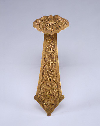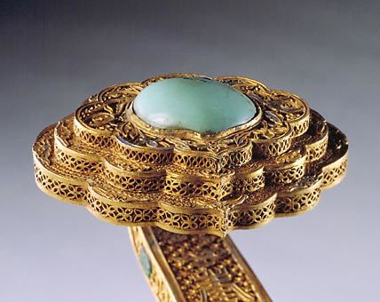 如意金累丝制,通体在钱纹地上饰云凤纹及寿字。如意首隆起成三台,中央嵌松石,柄嵌蓝宝石、碧玺,柄身两侧又以宝石嵌杂宝纹,朵状尾部亦嵌松石。金累丝纹饰上饰点翠,现多已脱落。