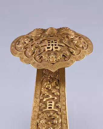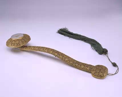 如意通体铜镀金錾蝠寿纹地。首尾圆形,并穹状隆起。首部中央嵌一白玉璧。此如意于金灿绚烂的富贵风格中又蕴含着古朴雅致之情趣。
