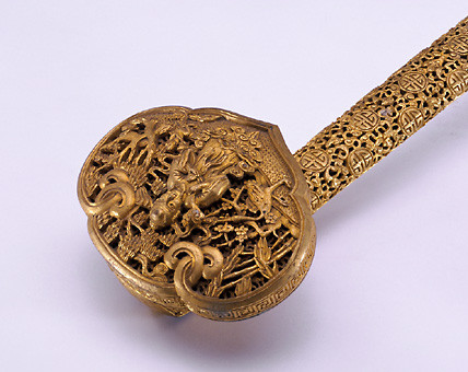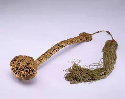 金属如意包括金、银、铜、铁等质地的如意,其工艺有累丝和镶嵌等品种。其中金、银、铜如意以錾花为主,又有铁错银如意为明代礼佛用品。制作工艺最为繁复精细的是金银累丝如意,更有在金如意上以珍珠、宝石、翡翠、玉瓦镶嵌出龙凤、花鸟、文字等纹饰者,堪称稀世珍品,价值连城。