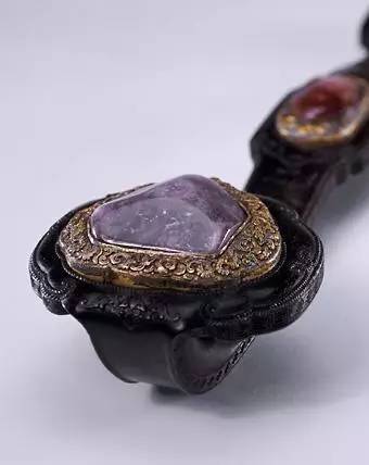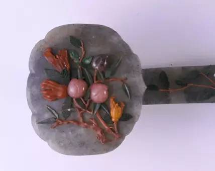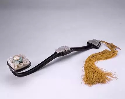 如意以沉着蕴藉的墨玉碾琢而成,并镶嵌桃、佛手等装饰。桃与佛手组合是明清时期常见的吉祥图案组合,再加上石榴就成为“三多”纹饰,寓意多寿、多福、多子。