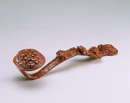 此如意造型圆浑,色泽微红,表面光滑,质地极为特殊,乃以雄黄矿中的结晶体“雄精”拼接碾琢而成。清代以降,雄精工艺品成为贵州等地的特产,但由于原料提炼十分困难,所以产量很低,存世更少。这件如意无疑为同类制品中的代表作品。