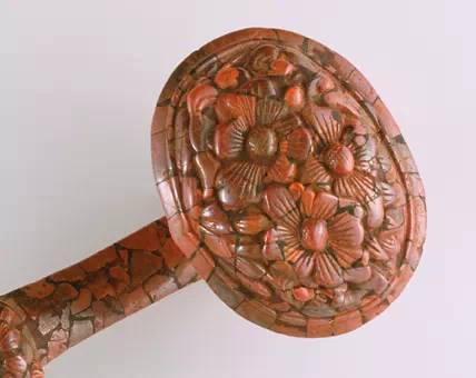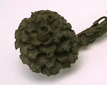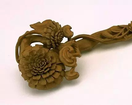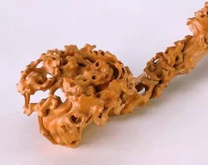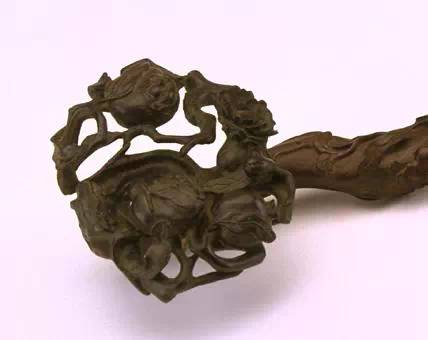 如意柄琢百合花为饰,首作2枚柿子相叠状,此为吉祥纹样中的固定组合模式,寓意“百事如意”。