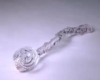 如意由整块水晶精琢成,灵芝造型,芝茎弯曲,茎身缠绕草叶、小芝等。芝茎中部琢阳文篆书“万年瑞芝”。芝首圆润自然,碾琢精细,抛光好。如意通体通透,晶莹光洁,透明度很高,为水晶中的上品。