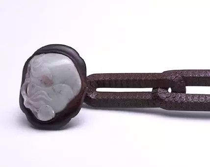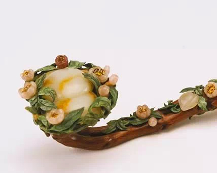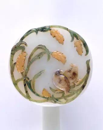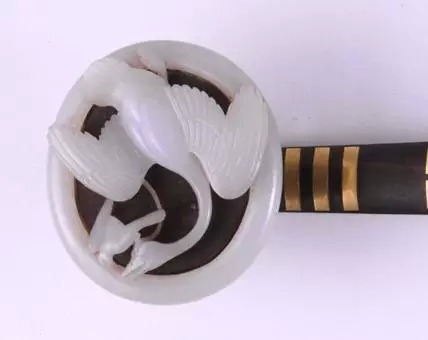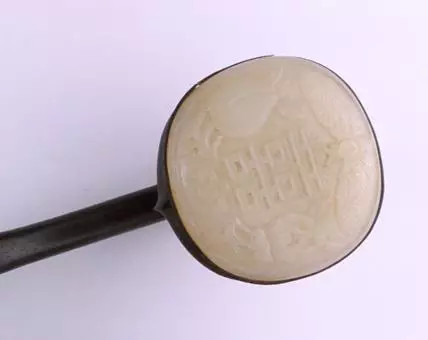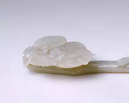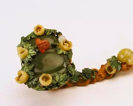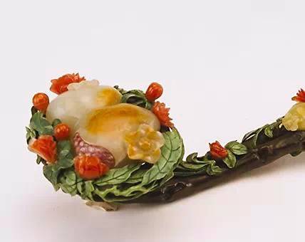 此如意首镶嵌玉石麦穗数株及鹌鹑2只,取“穗”与“鹌”之谐音寓意 “岁岁平安”。