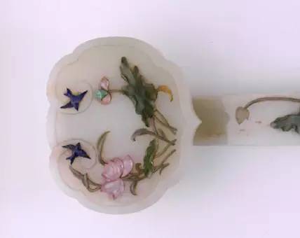 如意白玉质,首、柄嵌饰荷鸟图,以青金石镶嵌翠鸟,粉色碧玺嵌荷花,碧玉嵌荷叶,翡翠嵌莲蓬。白玉尾部凸琢出浪花与荷枝相接。