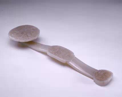 此玉如意借用三镶之形,于首、身、尾三部份分别碾琢福、禄、寿三星及八仙等神话人物,为常见的祝寿题材。