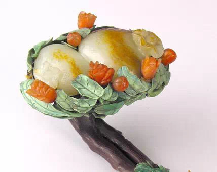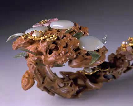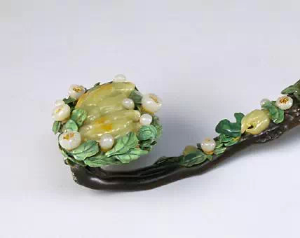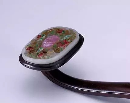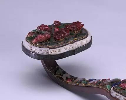 如意首、身、尾三处圆托内镶入青玉饰件,分别去地凸琢桃树纹样。桃树纹上又磨出凹槽,嵌入碧玺、翡翠等红、绿宝石,以表现花、叶、果实娇艳欲滴的不同色彩,同时以沁成赭色的玉石表现枝干,既生动传神又有俏色玉雕的效果。