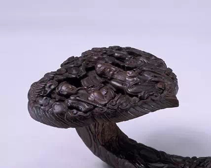 此如意曲柄翘首,呈天然灵芝形,柄茎上方分出两支小杈加工成小灵芝,芝首以自然根结略加刮磨而成芝朵,灵异逼真。此柄如意颇具雅逸之趣,雍正时的一幅王妃赏花图中,人物手中的如意即仿此柄而绘制。