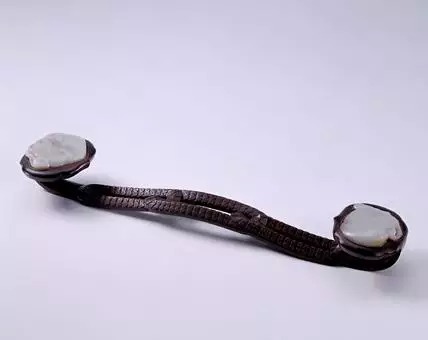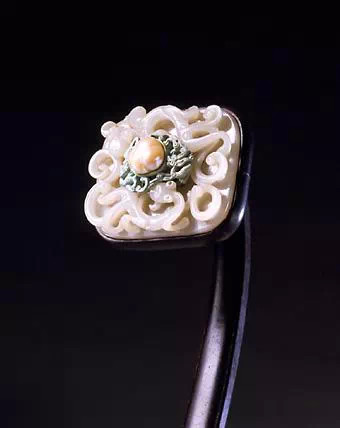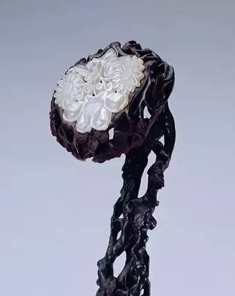 如意紫檀柄,首、身、尾镶螭纹玉璧、玉瓦,如意首玉璧的中央镶有一颗产自东北黑龙江流域的东珠,直径超过1cm。此颗东珠粒大晶莹,点缀在双螭之间,组合为二龙戏珠纹饰,光彩夺目。