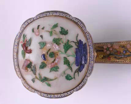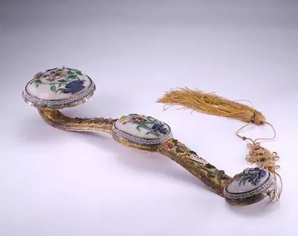 如意身银镀金质,首、身、尾镶嵌3枚圆形或椭圆形白玉饰件,其上又以碧玺、翡翠、青金石等嵌粘花鸟图案,色彩鲜艳,质地各异。器身又嵌粘花卉纹,尤以米珠连缀的菊花最为别致。此柄如意装饰华贵繁缛,为清晚期同类制品中的佼佼者。