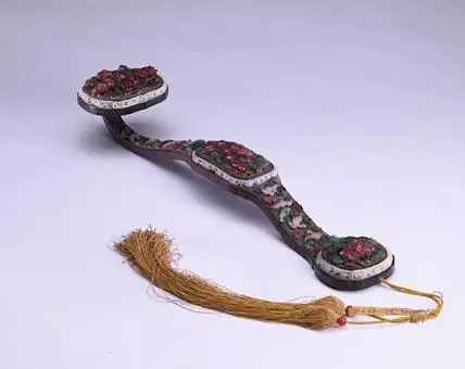 如意在以绳纹组成的三股束花木柄上浮雕牡丹花枝,心形如意首和柄身、尾部都镶有椭圆形錾缠枝莲纹的金托,托内嵌三块大碧玺,分别为紫红色与黄色,质地莹润,色泽鲜明,配以黄色盘长丝穗,显得分外庄重。其中牡丹寓意“富贵”,灵芝寓意“长寿”,合之为“富贵长寿,可如人意”。