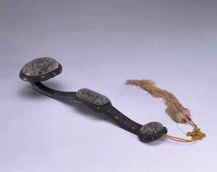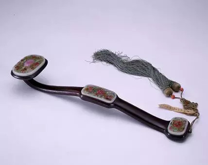 木柄三镶玉如意是清宫如意收藏中的大类,此种如意主要是为迎合帝王鉴古之雅好。其木柄质地有紫檀、花梨、黄杨、黄檀及檀香木等十余种,或为光素,或雕刻吉祥图案,或嵌金银丝花纹。如意的首、身、尾分别嵌饰玉雕,这些玉饰有历代古玉,也有清代专门碾琢的,如意上所镶古玉中不乏战国之玉佩、汉代之玉璧、宋元之玉带板、明之玉饰及清代翡翠等,也有清人用和阗玉仿古者,凡此种种,精美异常。