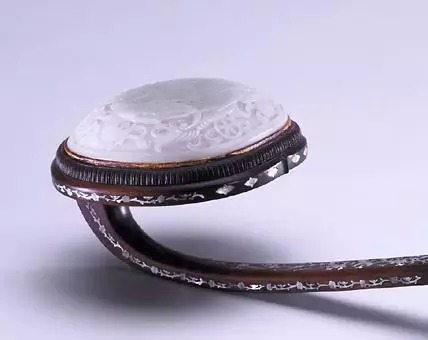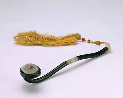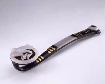 如意首镶嵌镂空仿古出廓玉璧,正中嵌红宝石一颗。柄纤细浑圆,分为二部分,各出凸榫,其间以一截玉雕圆管相接,恰是乾隆御制诗中“汉玉香檀接柄长”的生动写照。尾部亦镶嵌玉件,有云纹为饰。此器轻巧匀称,工艺出众,色彩搭配明快悦目,特别是红宝石的镶入,更为点睛之笔
