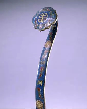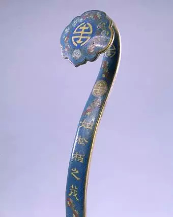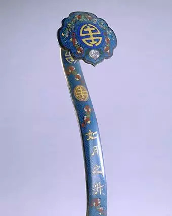 此套如意9柄,用掐丝珐琅工艺制作,在蓝色地上饰福寿纹。每柄如意曲柄上部分别掐丝隶书:“如山”、“如阜”、“如冈”、“如陵”、“如川之方至”、“如月之升”、“如日之恒”、“如南山之寿”、“如松柏之茂”,引自《诗•小雅•天保》,这是一首臣子为君主歌功颂德的诗篇,其中的譬喻到后世演化为固定的吉祥用语。