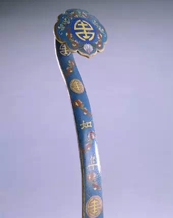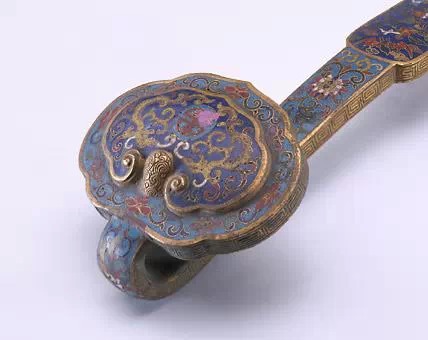 如意首中心突起呈台状,其内以掐丝珐琅工艺于蓝色地上用红、黄、白、紫等色装饰夔龙捧寿纹,与柄身中部所饰云蝠纹及柄尾所饰双鱼纹遥相呼应,此为仿流行的三镶如意装饰的一种变体。其余部分则以蓝地缠枝宝相花纹为主。珐琅釉色泽鲜明。