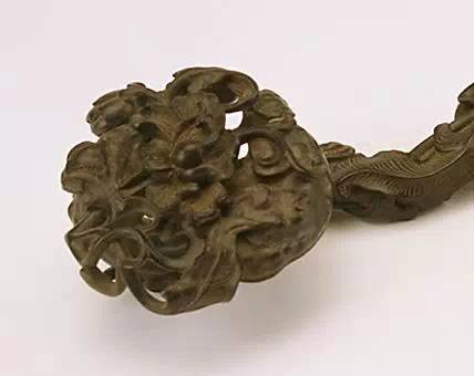 如意体形弧曲圆浑,通体镂雕勾连云蝠纹及团寿纹,布排错落。如意首为云头式,高浮雕寿星,其身侧有瑞鹤衔芝、白猿献寿及松柏竹枝等为衬。二层镂雕加之图案化的阴刻地纹,其装饰效果颇为丰富。背后则以小钉铆接平底,并錾刻缠枝花叶为饰。