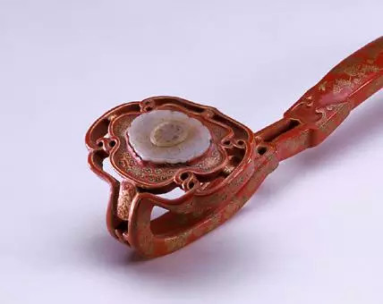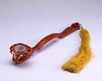 如意通体于红漆地上描金漆绘折枝花卉。如意首镶嵌玉佩。首、身、尾部皆有镂空雕刻。此如意漆色鲜艳,纹饰精美,再配以明黄色丝穗,愈彰显出富丽堂皇的宫廷气派。