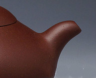 二)、壶嘴:紫砂茗壶的嘴,喻为人的五官之一,它与壶体连接,有明显界限的称“明接”。无明显界限,胥出自然的称“暗接”。如汉扁壶把,壶嘴与壶身的肩线,侧线贯通,形成舒展流畅的造型特色。