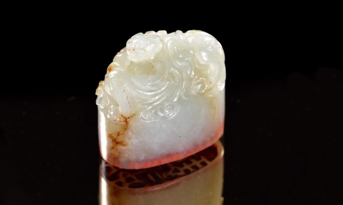 此方小玺制作于乾隆初年,体量虽不大,但雕刻精细,布局协调,立体螭身在云纹的衬托下丝毫没有单调之感。所用青白玉质地温润细腻,再加上特意浸染的红色石皮,显得相当精巧可爱。乾隆皇帝在玉材评判方面亦有自己的标准,十分钟情于具有沧桑历史感的汉玉材质,其御用宝玺中有相当多的作品就是用汉玉制作的。此方小玺的汉玉材质即反映出乾隆皇帝在玉材择取方面的这种爱好和趣味。查阅专门著录清宫书画收藏的《石渠宝笈》和《秘殿珠林》可知,此玺至少在清宫收藏的六十多件书画作品中钤盖过。