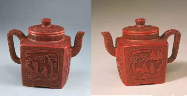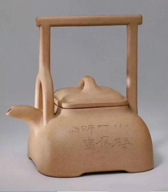 明晚期 宜兴窑“时大彬”款紫砂胎剔红山水人物图执壶
