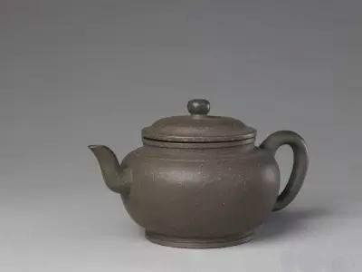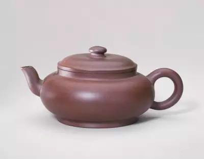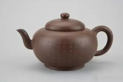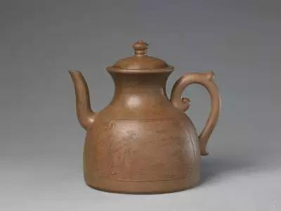 清乾隆 宜兴窑紫砂御题诗山水人物纹阔底壶