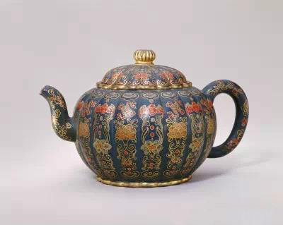 清乾隆 宜兴窑紫砂绿地描金瓜棱壶
