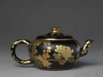 清乾隆 宜兴窑紫砂黑漆描金菊花壶