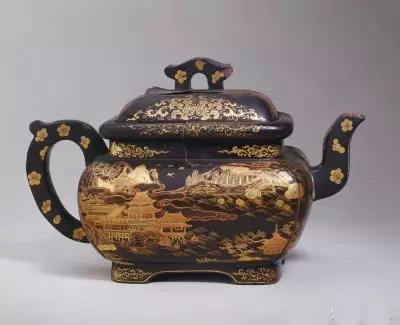 清雍正 宜兴窑紫砂黑漆描金彩绘方壶