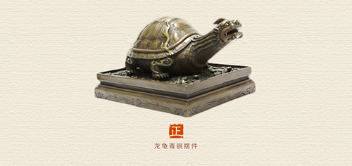 创意来自故宫乾清宫门前铜龟。与我们平时所认识的龟不同,这里的龟长着龙头。传说是龙之九子之一。名为“霸下”,平生好负重。相传上古时它常背起三山五岳来兴风作浪。后被大禹收服为其立下不少汗马功劳。治水成功后,大禹就把它的功绩,让它自己背起。龟是长寿和吉祥的象征,寓意龟寿延年、江山永固。