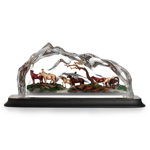 清代宫廷画家郎世宁所绘之《百骏图》长达7公尺,画卷描绘秋季牧放马群之景,细腻写实马匹骏逸百样景貌。“英骏承平”取郎世宁《百骏图》一景,骏马在和煦阳光中,悠闲啜饮,或宁祥渡河,或游嘻草原,呈现安和宁静之氛围与国泰民安之愉悦。