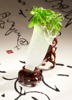 立体雕工法整体层次分明,色泽分布漂亮,秀气素雅,与真实翠玉白菜相似度近乎百分之百,线条优美,晶莹剔透,由高级琉璃历时甚久所雕刻而成的,限量手工制品,台湾制造。
