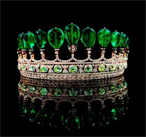 香港苏富比春拍会展出的CHAUMET绿宝石镶钻皇冠被誉为过去30年来拍卖市场上最为重要的稀世之宝,其估价约为500万至1000万美元。此皇冠上方镶有11枚罕见不凡的梨形哥伦比亚绿宝石,共重逾500克拉,份量惊人,相信曾属于拿破仑三世的妻子欧金妮皇后的私人珍藏。