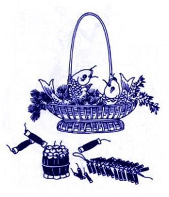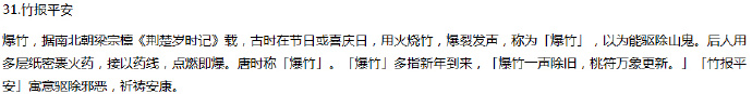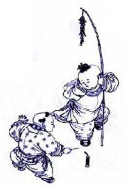 解题:用爆竹,民间玩具等寓意年节的到来。「鱼」与「余」同音,比喻生活富裕,到年节之时,家境殷实。这表达了古代人们追求年年幸福富裕生活的良好愿望。在中国,无论城乡,把这愿望形之于图画的习惯,至今未颓。过新年的时候,家家挂一张儿童抱鲤鱼的年画,既表达欢庆之情,又图来年吉利。