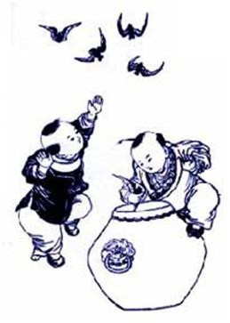解题:和仙、合仙,是指高僧寒山和拾得。寒山,一称寒山子,唐代僧人,相传他居丰县(今浙江天台)寒岩,喜吟诗饮酒,与天台国清寺僧人拾得为好友。清雍正十一年,寒山,拾得被封为和圣与合圣,世人称「和合二仙」或「和合二圣」。「盒」与「合」、「和」同音,喻「和合」。旧时民间嫁娶,喜挂和合像,取「和谐好合」之意,以图婚姻美满。