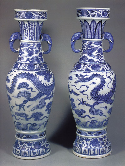 镇馆之宝 至正型青花龙纹大瓶 这对龙纹大瓶几乎囊括了除人物外元青花绘画的全部元素,如龙纹、海水、蕉叶、扁菊、云纹、杂宝等,且绘制精良,难有与之比肩者,故此对大瓶作为元青花标准器当为魁首。