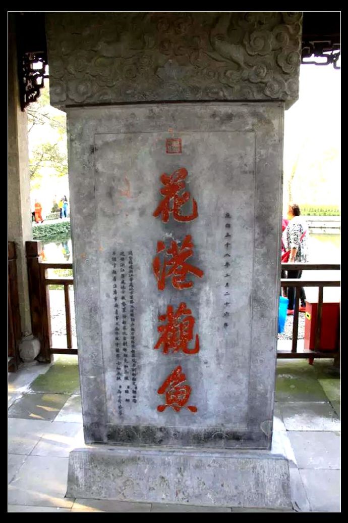 在杭州西湖苏堤南段西侧有一石碑,是康熙皇帝题字:“花港观魚”四个字。康熙三十八年,玄烨驾临西湖,题书“花港观魚”,刻石碑建于魚池畔。