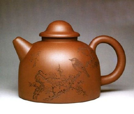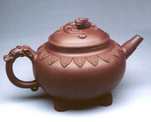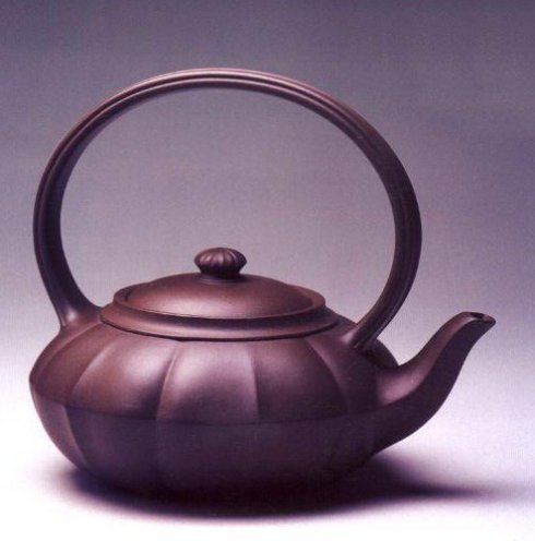饱满挺秀的壶身对称圆弧型盖和盖上的圆桥型钮。而圆弧嘴向上伸,环型把重心向下及中央的盖的三者又有着横向呼应的协调。紫砂色润而华美,绞泥细纹如开片冰纹,有自然奇趣。