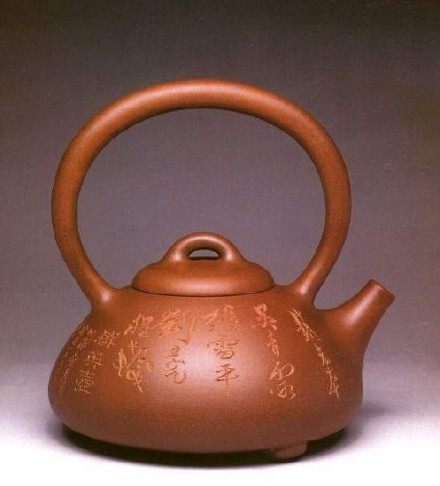1992年四海壶具博物馆落成,海上画会诸名家齐聚共贺,汪寅仙制此壶为记。夸张的提梁擎起一道弧线,巧妙地为扇型圆弧壶身创造光圈效果。既像征群英聚集哲哲耀目,又似壶界与艺坛相互辉映。稍长的壶嘴衔接壶身形成拉高的线条,与弧形提梁呼应,构成一种向前的动势力感,颇有邀人畅饮的意味。壶身素面铭刻众画家名,由高式熊书,山头上人姚志源刻,笔下苍劲有力,掌握各画家签名的韵味。