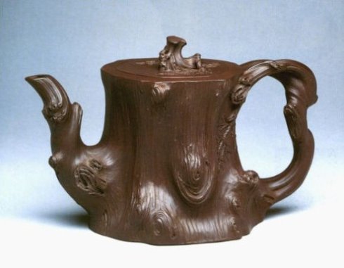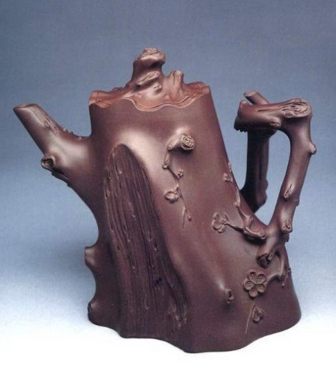 壶身与身上脱皮露骨处及流形成整个由右下向左上斜倾的势态,赖左下两节砍去的粗枝头稳住下盘,口、盖以波形线条缓和形势;盖与的为奋力向右扭转的桩头,创造反向抗力,直至突起回旋的梅干弯把使不稳定的紧张状态趋于平衡,完成整体的和谐。此壶奇巧有大趣。