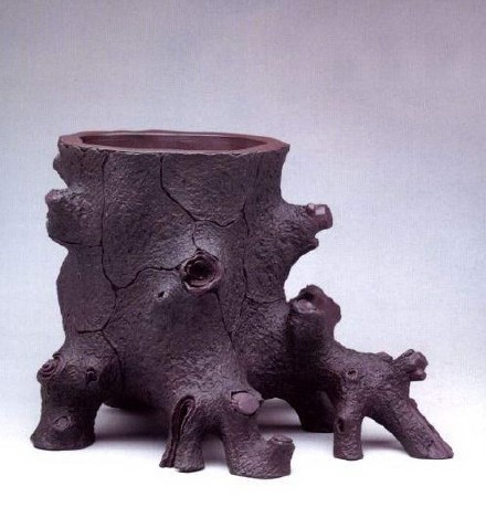去皮露骨树桩为筒,根干为足,朴质有味。刻意将去皮处紫砂处理得润泽光滑,对比斑驳粗皮,形成装饰变化。老皮随干转折扭曲,增加视觉的动感,引人流涟。