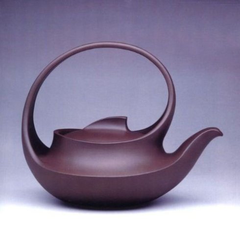 曲壶形象源于蜗牛的有机生态,通壶以一条涡线贯通,同时形成线与面的变化。线条处理清晰挺秀,静中有动。流与把所形成的虚空间与壶的实体对比强烈,巧妙地勾勒壶体的廓美。在紫砂陶艺的设计概念上,曲壶有着突破性的成就。
