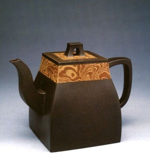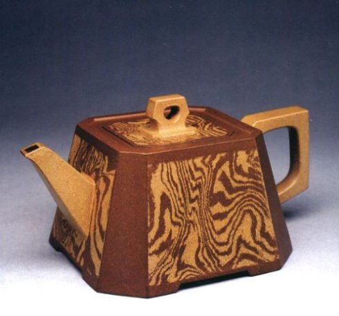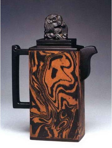 壶身作上小下大的八棱形,四个大面与盖面以红、褐两色相绞,纹样如云似水涌动变化,其余窄面及把、嘴采褐色,更衬托了绞纹装饰的华丽。