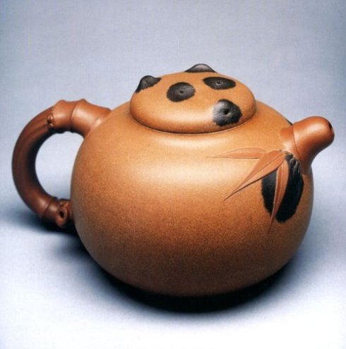 圆胖壶身为熊猫身,盖为熊猫可爱的脸孔,短嘴为竹,把手亦塑成弯曲的竹节。流旁的壶身上饰有熊猫短胖小手捉着竹叶,憨厚有趣。