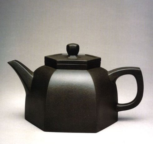 墨绿泥色铄铄,有光泽,衬得作者精致的工夫更突出。六方块面比例正确、弧度饱满;凸线乾净圆整,向上延伸成六方直颈和盖,连盖的皆为六方圆珠型,口盖密合且面面通转。流、把搭配出色。此壶骨肉亭匀挺括大方。